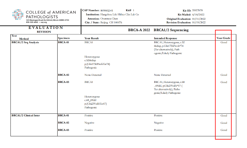 本次BRCA-A 2022室間質(zhì)評(píng)旨在評(píng)估全球基因診斷實(shí)驗(yàn)室對(duì)BRCA1/2基因突變的檢測(cè)和分析解讀能力。本次室間質(zhì)評(píng)共發(fā)放三個(gè)待測(cè)樣本,涵蓋BRCA1/2基因點(diǎn)突變、插入和缺失等突變類型,雅康博生物所提交的結(jié)果與CAP官方標(biāo)準(zhǔn)一致,最終以評(píng)級(jí)全部為good的優(yōu)異成績(jī)完美通過(guò)。